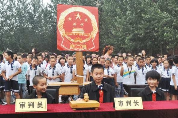2日,聊城大学法学院法律援助中心的大学生在开发区实验小学举办模拟法庭,让小学生“法官”审理“校园伤害案”,以案说法增强学生的法制观念和守法意识。