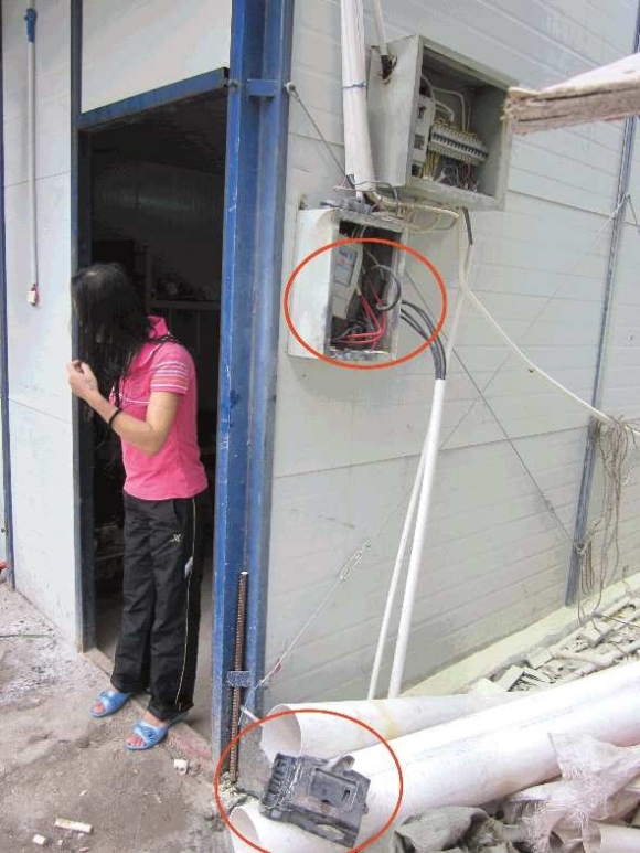 住在板房里的多名工人反映,这个电表没有盖,下雨的时候会被淋湿,怀疑是电表潮湿引发了事故。