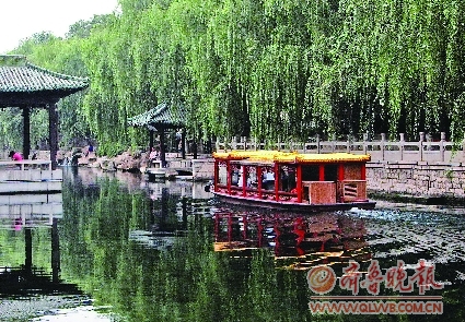 5日,群泉滋润的护城河,垂柳倒影依依,游船仿佛在画中穿行。