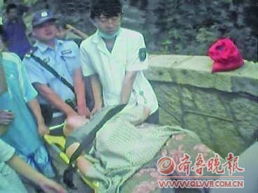 120医生对李大娘进行了简单的输液治疗后,将其固定在担架上,然后热心市民和随后而来的110民警协力将李大娘抬下了山。