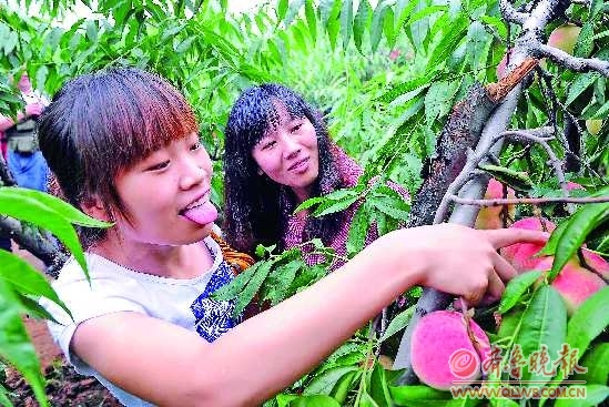 桃子也尝了,下面就是采摘了。当地为本次快乐大采摘活动预留了几个桃园,桃园里的桃不一样,车友一边尝一边比较,挑好了口味才下手。桃子好摘,但是摘到特别大的桃子还得费一番功夫。树上挂着桃子,桃树间距较小,桃树又不高,人在桃园里穿梭,可得处处小心,需要不断地用手拨着树枝前行,很多大桃在桃园深处,或者不好采到的地方,采摘起来并不那么容易。