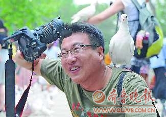 自述:一只鸽子突落肩头,来个亲密照吧。