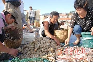 5日,在沙子口渔港码头,几名商贩正在码头边上抢购渔民刚捕捞上来的活海鲜。据了解,自9月1日开海以来,青岛渔民出海捕捞的海鲜数量较往年相比有所下降,价格偏高。但记者调查发现,排除人工、燃油等成本影响外,商贩低价收购、高价转手是导致海鲜价格持续走高的主要原因。本报记者 张晓鹏 摄影报道