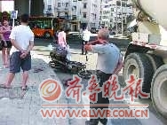 下午4时许,记者闻讯赶到抚顺路批发市场附近事故现场时,哈尔滨路和鞍山路的路口被放上了三个水桶当作路障,一辆摩托车倒在路边油箱不断漏油,地上除了一个帽子,一盒烟外还有一大滩鲜红的血迹,血迹北侧三四米远的地方停着一辆白色的斯太尔大搅拌车,车的一侧一块挡泥板断了。现场有不少市民围观,交警也在现场测量数据。