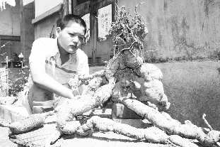 蒙阴蒙山脚下康庄村农民类成祥在家东面挖出一巨型野生白何首乌,重量30余斤。图为一村民正好奇地观看巨型何首乌。
