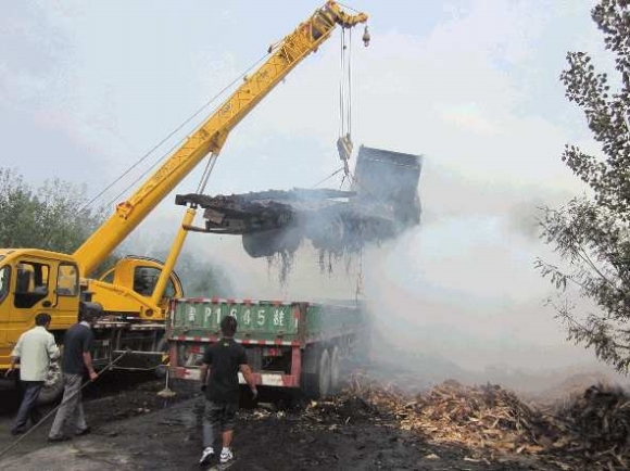 5日上午10点多,记者在聊临路许庙桥北约500米处看到,一辆大吊车正在吊一辆烧得只剩下铁架的大货车,附近路面上堆着没烧完的树皮正冒烟,3名男子拆下大货车上的大油桶抬出现场,里面还有很多柴油,油桶外壳烧得黑糊糊的。围观村民说,要不是消防队员用水枪控制住火势,这个油桶肯定得爆炸。
