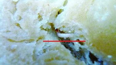 据李女士反映,9月4日早上,她拿出月饼准备要吃,可刚撕开外包装纸,就看到一条白色虫子在里面,这下让李女士惊呆了。她说,这包月饼是从广饶某超市购买的散装月饼,但是购物小票已弄丢,于是她拨打月饼包装上的“寿光市亚星食品厂”的联系电话,却被告知是空号,一时间她不知道该如何处理。