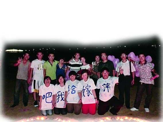 带头策划求婚的小王告诉记者,小刘和小崔是高中兼大学同学,“他俩相处6年了,什么都准备好了,就差领证了,当时是小刘提出来要浪漫求婚,我们在网上也查阅了很多求婚的形式,大家想了很多浪漫的场景,最后定下了这个。”由于他们平时还上班,12个人忙里偷闲用了三个月的时间准备。“采购蜡烛、气球、烟花,还买了白T恤,自己写上‘萍,嫁给我吧!’的字样,今晚布置这个场地从6点多一直忙到9点多。”