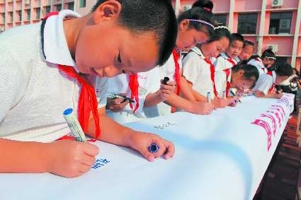 5日,滨城区第三小学举行新学期第一次升旗仪式,同时启动了“做文明师生 读经典名著 诵精美诗文 建书香校园”活动,学生们在横幅上签下自己的名字。“我们力争通过这次活动,增加孩子的课外阅读量,提高学生的读写能力。同时,通过书香家庭建设,引领家庭和社区树立良好读书风气。”校长李晓峰说。 记者 张雪丽 摄影报道