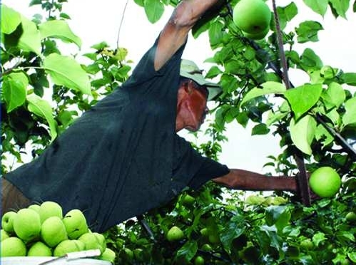 近日,在“中国鸭梨之乡”山东阳信县,万亩早酥梨、绿宝石等早熟品种梨喜获丰收,早熟梨亩产量达到3000公斤--4000公斤,平均亩收入7200多元,其中早酥梨每斤价格达到1.2-1.3元,比去年每斤提高0.3元。图为一果农在正采摘成熟的鸭梨。