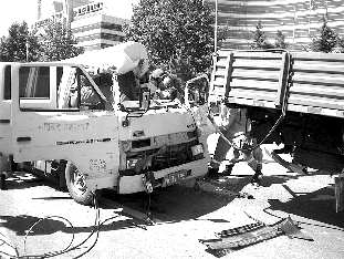 消防队员赶到现场时,发现事故前车为一辆绿色解放牌大货车,后车为一辆白色五十铃小货车,巨大撞击力使得前车车尾插入白色小货车驾驶室,而且正好是驾驶员位置,严重凹陷的驾驶室把司机死死卡在座位上。