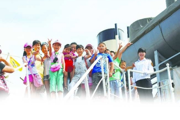 随后,孩子们和家长进入舱内,参观鱼雷发射管、军官宿舍、士兵吊舱,听导游讲述北洋海军从成军到覆灭的全部历史过程,还观看了光电模拟的威海保卫战历史画面。轰隆的炮击声中,孩子们神情严肃,沉默无声,全然没了此前的调皮。