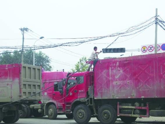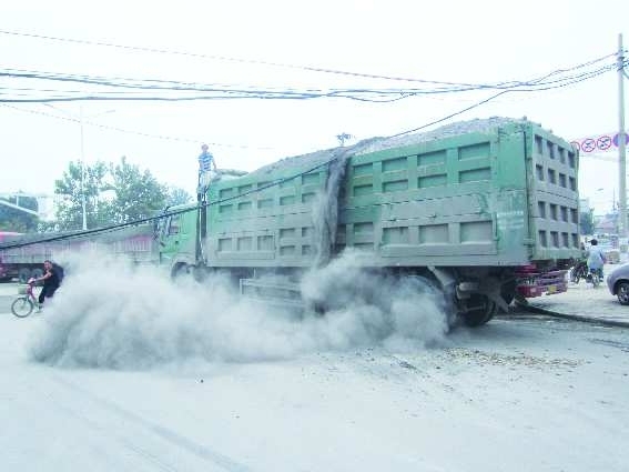 记者看到,一些满载沙石、土灰的大货车通过时,虽然车头处有人将线缆抬高,但货车通过时,车斗上面的沙石、土灰等还是有不少被线缆刮蹭下来,马路上扬起了阵阵灰尘。
