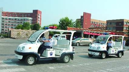9月5日,市城管执法局监察支队投入15万元购置的3部城管执法电动巡逻车,经过一段时间的试运行后正式发放一线执法中队并投入使用。据介绍,电动巡逻车最高时速可达40km/h,与燃油车辆相比,具有轻便节能、绿色环保、噪音小、上下车方便、视野开阔等特点。主要用于城区主干道、风景区、广场等重点部位的日常巡查。图为执法中队在滨州学院周边进行巡查。 通讯员 赵晓明 吴成波 记者 王传宝 摄影报道