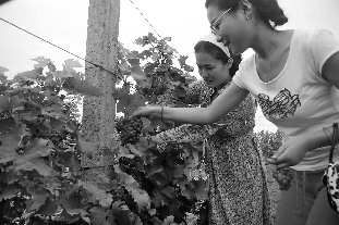 3日上午,在德州市德城区黄河涯镇奥德曼葡萄庄园内,来度周末的市民纷纷走进葡萄园采摘品尝葡萄,并参观该庄园的葡萄酒酿酒工艺。 本报记者 王金强 摄