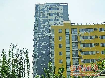 小区内一家商店的店主周先生告诉记者,这可不是墙皮脱落,而是物业公司在整修墙面。“这些白斑都是工人铲下来的,听物业公司的人说要对楼体进行重新粉刷。”周先生还告诉记者,物业公司的工作人员说周边的楼体全都要进行粉刷。