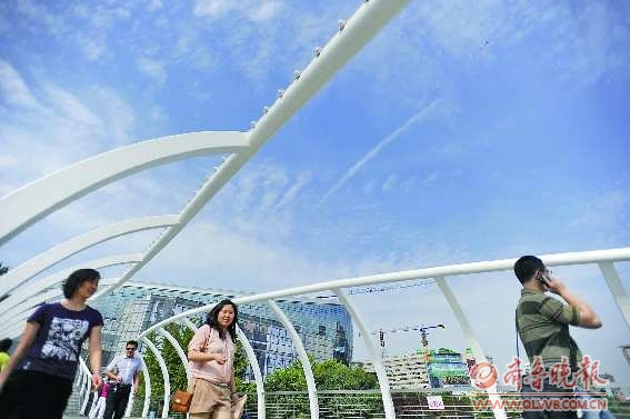 9月6日,在泉城广场。如明镜般的蓝天有了不少秋天的气息。但到了下午,蓝天就被乌云遮住,气温随之下降。