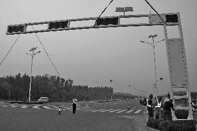 德州市区新河路与广川大道、新河路与晶华大道、东风路与太阳谷大道等23个交叉路口太阳能信号灯土建、安装任务在紧张进行。图为市政设施管理处工人正在对新河路与广川路交叉路口的信号灯进行安装。        本报通讯员 宫玉才 摄