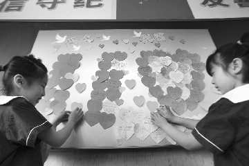 6日,在青岛市实验小学,二年级一班的同学正在制作印有110颗心形祝福的展板。据介绍,青岛市实验小学即将迎来110周年校庆,学生特地收集了同学们写的心形纸条制作成展板,以此来表达对学校的祝福。