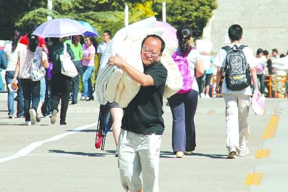 6日,山东大学威海分校迎来了新生开学的第一天,不少新生在家长的陪同下前来报到。很多父母帮着自己的孩子领取被褥后,亲自背往宿舍,为了孩子再苦再累也愿意。