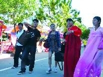 6日,在山东大学威海分校迎新现场,两位身穿韩国民族服装的迎新志愿者在给报到新生引路。为了让该校韩国学院的新生感受到专业特色,韩国学院的迎新志愿者特意穿上了韩国民族服装。