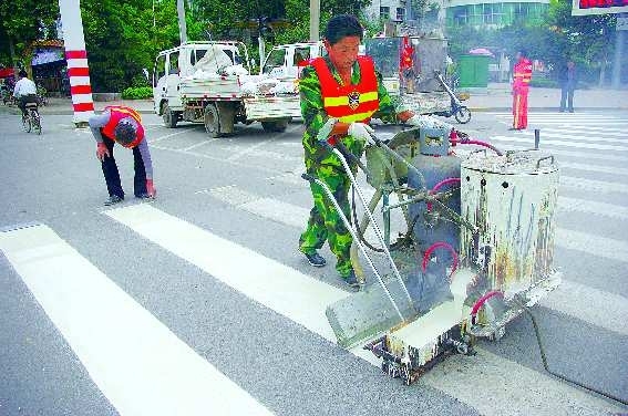 6日,记者看到菏泽交警部门工作人员在中华路为马路画“新妆”。据介绍,为保障道路交通安全,菏泽公安交警部门从4日起陆续为全市马路画上“新妆”。由于白天车辆繁多,工作人员只能通宵作业。