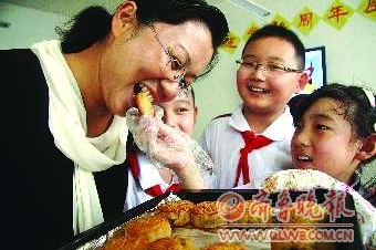 7日上午,德兴街小学的师生一起制作烘焙月饼。学生们将自己亲手制作的月饼献给老师品尝,迎接即将到来的第27个教师节。