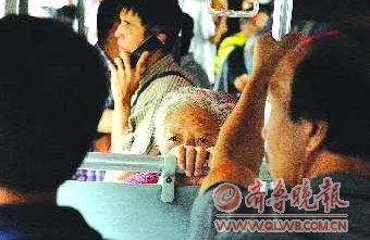 7日,BRT3公交车上,一位老人手扶铁栏杆,用眼睛巡视周边,希望能找到让座的人,但是没有,直到她下车为止。年轻的乘客们,老人的眼神您看见了吗? 本报记者 周青先 摄影报道