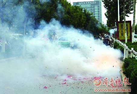 7日11时左右,湖滨中大道,婚礼鸣放礼炮,震耳的声音和浓浓的烟雾使过往市民难以前行。