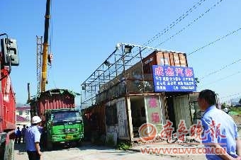 拆除行动从上午9时开始,因3个集装箱焊接在一起,必须用电气焊将其分割,然后才能吊离,拆违工作一直延续到14时,4个集装箱才全部被吊离运走。