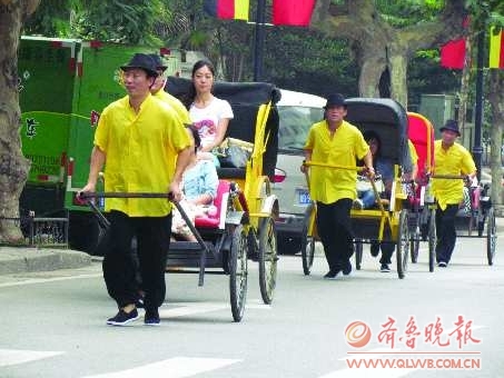 7日,在馆陶路上,身穿黄马褂、头戴大草帽的黄包车夫又出现在马路上。据介绍,交运集团为配合即将到来的“德国商展会”,购买10辆人力车,让游客亲身体验旧时交通工具的魅力,还原老青岛独特的人文风情。