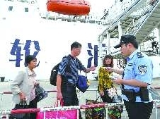 7日,在烟台市环海路客运码头,民警利用身份证识别仪检查旅客身份信息。9月14日,世界经济论坛2011年新领军者年会(2011年夏季达沃斯)将在大连市举办。为确保烟大“黄金水道”安全,山东烟台港公安局积极调配警力,加强对人、船、物排查力度,为达沃斯论坛期间烟大航线创造良好的水路运输环境。