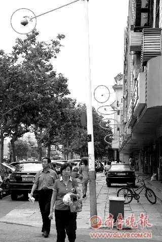 7日,在新威路上,很多商家门口安装了摄像头,在短短的百米距离内就有5个摄像头。