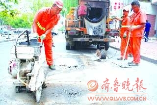 7日,在光明路与新威路交叉口,市政部门的工作人员,正在为市区内的道路进行修复,把一些裂纹和破碎的路面重新铺垫。据了解,环翠区、高区、经区都有工作人员在进行修补。