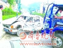 7日早上7点半,北山路20路公交站牌附近发生了车祸。据现场目击者林先生讲述,一辆自北向南行驶的蓝色大型货车开得很快。北山路侧面小路突然驶出一辆自西向东行的小货车,欲拐弯上北山路。大货车急忙刹车,避免了与小货车相撞,却撞到了北山路一辆停在路西侧的白色轿车。“白色轿车当场被撞烂了,玻璃碎片四处飞溅,还好路上行人少,没有伤到人。”林先生说,“我们几个目击者赶紧跑到白色轿车前查看有没有人员伤亡,还好车里没人,要不后果不堪设想。”