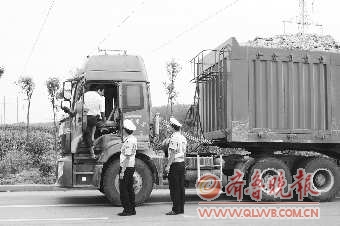 几分钟后,巡查车队行至206国道与西王庄乡西花沟村路口时,巡警们看到一辆装满石膏的大卡车,没有悬挂后牌。经检查,驾驶员所有的证件都合法,前置车牌也完好无损。经巡警孙晋鹏指点,记者仔细一瞧才发现,该车的后牌照架没有按照规定锁住,所以车牌垂了下来。