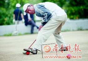 9月6日上午,东昌府区第六届“七夕”老年人“鸳鸯”门球赛在铁塔老年体协门球场开赛,全区18个镇、街道、区直单位的36对夫妇参赛。图为7日上午,参赛选手正在击球。