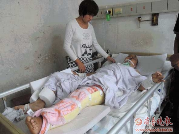 7日下午,在聊城市脑科医院神经外科,东昌府区侯营镇蒋庄村黄女士躺在病床上,从额头到下巴有一道宽约5毫米的疤痕,嘴里放着食管,靠呼吸器呼吸。左腿固定着,右小腿也围着一个弧形海绵物,右脚上扎着吊针。