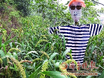 走在济南市南部山区的一片谷子地里,发现了一个戴眼镜的稻草人。稻草人看护庄稼都是“义务”的,现在也要求有文化了。