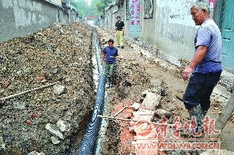 8日上午,记者来到杨庄东路2号楼下,不少居民正在施工现场,一见到记者,小区居民高兴地说:“被堵的换粪池管道终于要重新安装了。”记者现场看到,2号楼斜对面向西的近百米道路已经挖出一条沟,新更换的管道已全部放进沟内,三名施工人员正在砌管道东头的检查井。一名施工人员介绍,他们从6日就将地下的管道挖开,并对原被堵的化粪池管道进行检查,发现堵得非常严重,已经不能再用了,向相关部门反应后,决定重新安装新管道。“新管道长近60米,直径30厘米,目前已经安装到位,下一步就是将管道截开,再砌4个检查井,最后将道路重新铺设,预计到12日全部完工”。
