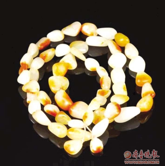和田玉籽料串,55粒。皮色之美有时是无需人为再加工的。这件手串由56粒大小各异的和田玉籽料组成,均为带皮籽料,皮色金黄艳丽,肉质细腻洁白,可谓颗颗精品。在高端籽料日益珍贵的今天,这样一条籽料项链显得尤其难得,很适合把玩与珍藏。