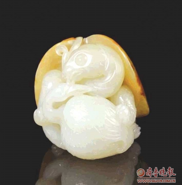 龟鹤,7.6厘米×5.8厘米×5.8厘米。龟鹤题材是中国艺术品自古所爱,因而如何能雕出新意,雕出特色,就成了每一个碰到此题材的玉雕师首先要解决的问题。这件作品皮色黄艳迷人,肉质白润细腻。将皮色雕琢为乌龟龟壳,既显灵龟仙体,又具古拙之气。另一边厢,仙鹤曲颈,将嘴喙置于龟上,与龟相互呼应。龟鹤均为祥物,有延年益寿之吉祥寓意。
