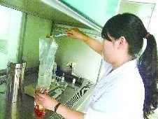 称量完毕后,夏辉把这包混合溶液放进均质机,这台机器有两个“拍板”,会不断地拍打这包溶液,“大概需要1—2分钟的时间,把液体混匀。”夏辉介绍,然后吸取均质好的溶液进行接种试验,加入适量培养基,进行培养,整个过程都是在超净工作台里完成。“接种工作要在酒精灯外焰处进行,因为此处温度很高,基本上属于无菌区域。