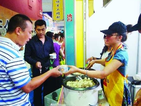 在贵州千户苗寨展位前,3位年轻女子身穿传统苗家服装,头戴苗族头饰,脖子上、手上挂满了各类银饰品,举手投足之间,银饰品发出清脆的敲击声,在灯光的照耀下反射出片片闪烁的银光,让无数顾客流连忘返。 经营越南沉香的I.G先生,用一只古香古色的铜炉点燃了一段沉香木,缕缕幽香飘出,很多经过的顾客不由自主地停下来细细嗅上一嗅。 台湾一家食品展位前,两口盛满各色丸子的电饭煲“咕嘟咕嘟”冒着热气。不一会儿,摊位前的每一位顾客手中都端上了一碗香气四溢的丸子。 纵观临博会,就像一道色香味俱全的自助大餐,吸引着来自全国各地的10万“食客”。