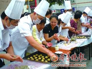 揉面皮、包馅料、压模子,7分钟后,来自辖区家家美食广场的黄艳艳和刘佳炜就第一个完成了20个月饼的制作。两个80后的小姑娘非常兴奋:“我们俩都是第一次做月饼,没想到居然得了第一!感觉这样的DIY特别有趣!”