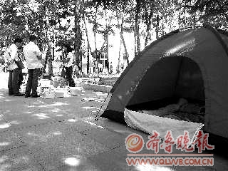 8日,在山大威海分校迎新现场,记者看到许多摆摊的大学生搭起了帐篷。在海洋学院读大三的小黄租借了一顶帐篷,晚上睡在里面看管摊位上的物品。他介绍说,今年的摊位数量达到了140多个,去年顶多也就100个。