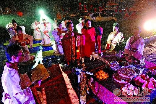 12日夜,济南大明湖附近的街头,一群汉文化倡导和爱好者举行了隆重的汉代形制拜月仪式。拜月者们身着汉服,宣读拜月祝文,祈福中华民族和谐安康。组织者称此举是为了提醒人们不要忘记我国有着优秀的文化传统。 本报记者 周青先 摄