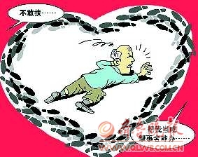 9月12日,市民王女士给本报打来电话称,9日清晨5时许,在西城嬉水公园,一老汉在晨练时突然摔倒在地,当时现场有20余人围观,却没有一人伸手帮助。事发十余分钟后,一名晨练至此的医生看到这一情况后立刻对老人进行了施救,随后该医生还请路人拨打了120,由急救人员将老人带回了医院。