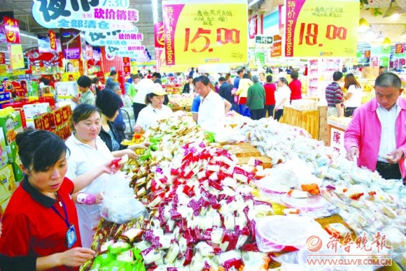 12日,洸河路上某超市的月饼专柜前,各种口味的散装月饼都被摆在促销柜台的显要位置,不少来超市购物的市民奔着优惠价前来购买月饼。据该月饼专柜的负责人刘经理介绍,由于这天是中秋节假期的最后一天,相比之下,散装月饼还剩了一些,为了将这些月饼尽快处理出去,各个品牌的月饼都进行了“清仓处理”,降价幅度在五成左右。