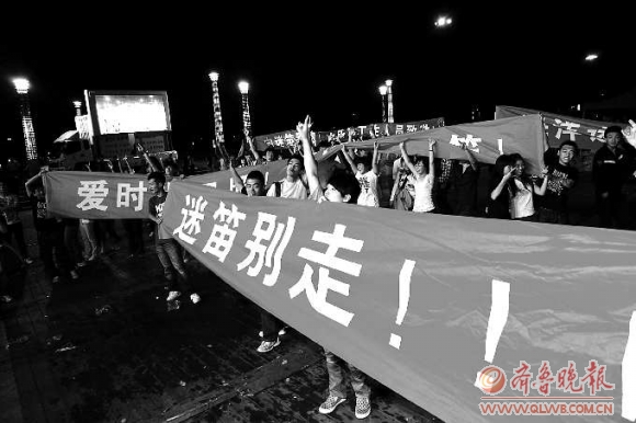 接近晚10点的时候,来自现场的一些乐迷自发地面向舞台打出了横幅,上面写着“迷笛别走”、“爱时尚日照,爱海洋迷笛”、等标语,有些乐迷还留下了激动的眼泪。